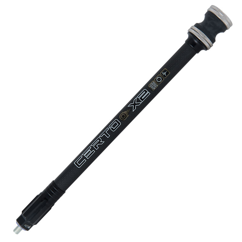 The MyBo Certo X2 Lateral Stabilizer is designed for tournament archers, offering exceptional performance in real-world shooting conditions. With a 19mm high-stiffness carbon shaft, lighter and optimized components, and a satin black finish, this refined version of the popular Certo includes solid aluminum mounting bushings, a silicone dampening unit, low-profile solid steel weights, and an internal foam insert to reduce vibrations. Ideal for archers seeking precision, stability, and lightness.