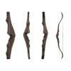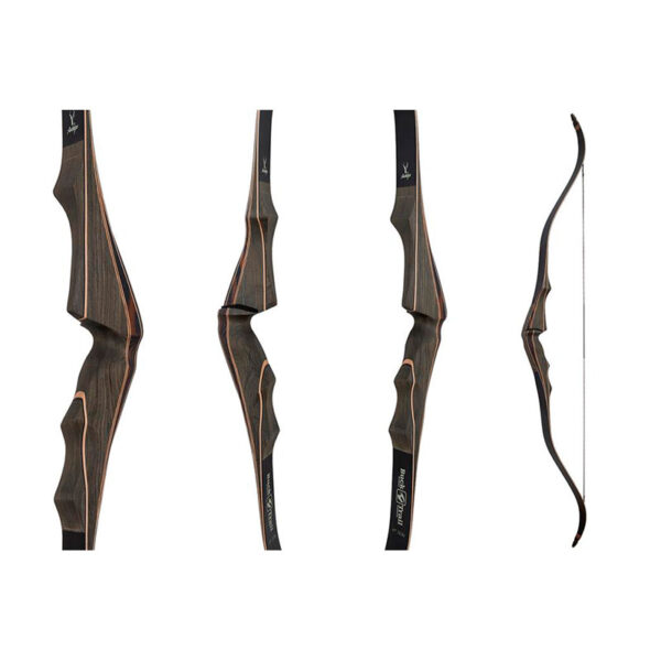 Arco recurvo con una longitud de 60 «. Ideal para iniciarse en el tiro tradicional. Está construido con laminas de madera de nogal y Dymondwood y está rematado con ramas de arce y vidrio negro.