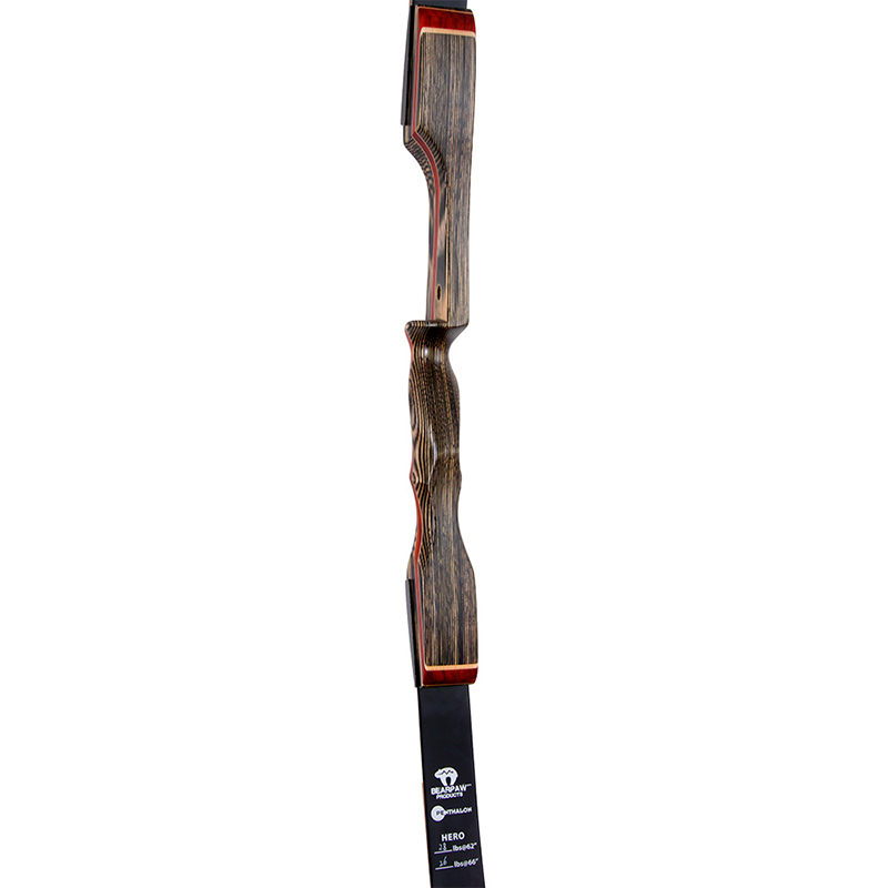 El arco de la serie Hero de Bearpaw es un hermoso arco a menor precio con atractivas combinaciones de madera y el gran rendimiento de sus palas planas. El cuerpo está hecho de madera de negra con padouk y rayas de acento de arce oscuro y ahumado, acentuadas con franjas de arce y bubinga que en contraste tienen un gran apariencia estética. El arco recurvo es una combinación perfecta de estética agradable y buen rendimiento.