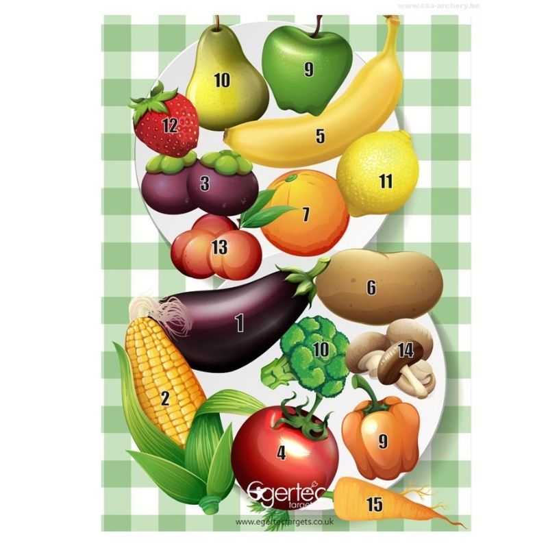 Diseño de diana para tiro con arco recreativo o de juego con dibujo de frutas y vegetales.