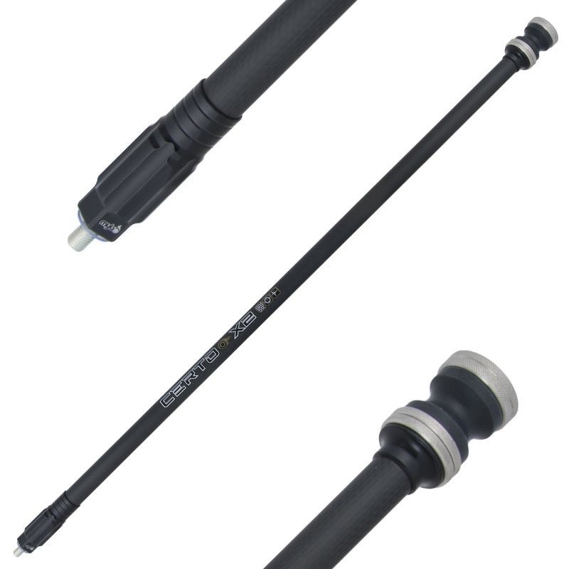 Estabilizador Largo Maybo Certo X2 para arqueros de torneo. Con un vástago de carbono de alta rigidez de 19mm, casquillos de aluminio y un eficiente amortiguador de silicona. Más ligero, con componentes optimizados para un rendimiento superior en condiciones reales de tiro.