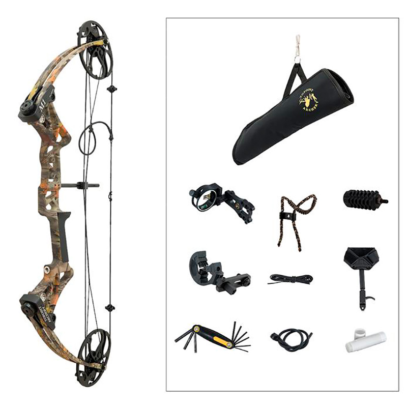 Kit Completo Arco de Poleas ToPoint M1 Beginner 20-70LBS 19-30” incluye los accesorios que aparecen en la fotografía: Carcaj, reposaflechas, llaves allen, dragonera, peep, loop, damper, disparador y cera para cuerdas.