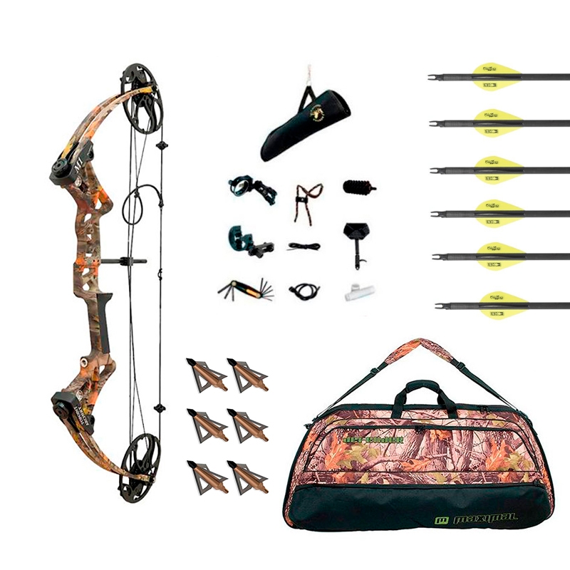 Kit Completo Arco de Poleas ToPoint M1 Beginner 20-70LBS 19-30” incluye los accesorios que aparecen en la fotografía: Carcaj, reposaflechas, llaves allen, dragonera, peep, loop, damper, disparador y cera para cuerdas.
