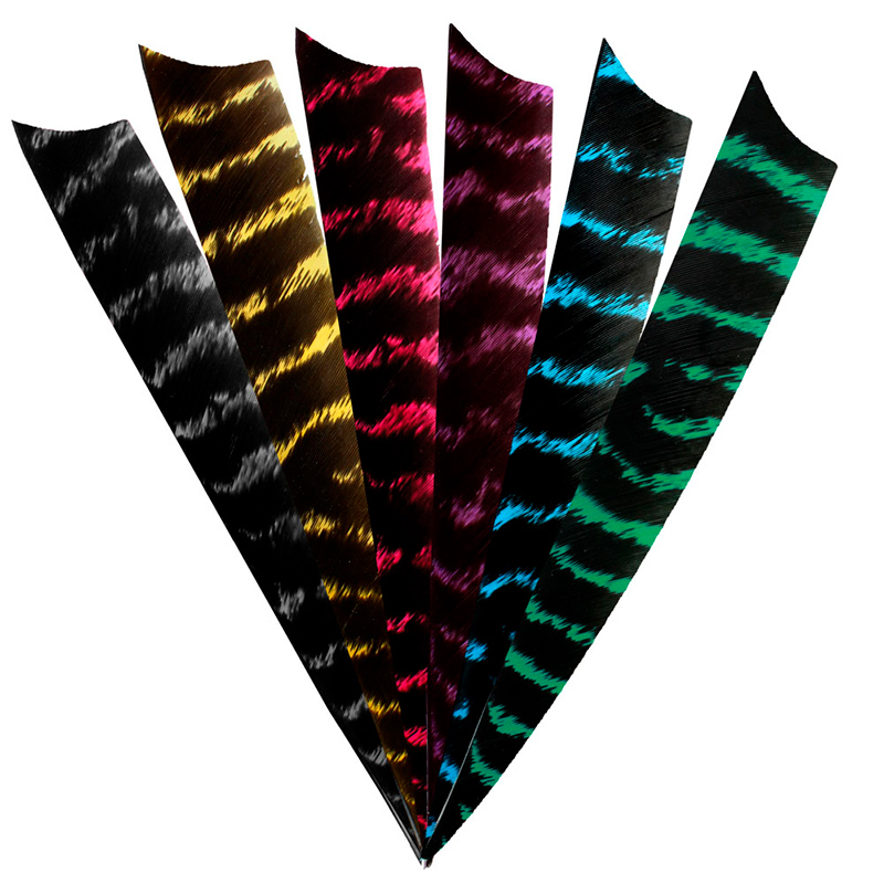 Plumas de pavo barradas con colores y patrones naturales únicos. Aspecto y tacto muy especial y natural. Las plumas más comunes en el tiro con arco tradicional son las de 4”. Son la mejor opción para un equilibrio óptimo entre la estabilización de la flecha y la velocidad de la flecha. Ya sea que esté disparando un arco de menor potencia o un arco más potente, las plumas de 4″ son una gran opción para un vuelo preciso y constante. Con un perfil más plano en la forma de escudo para optimizar perfectamente la estabilización y la velocidad de la flecha.
